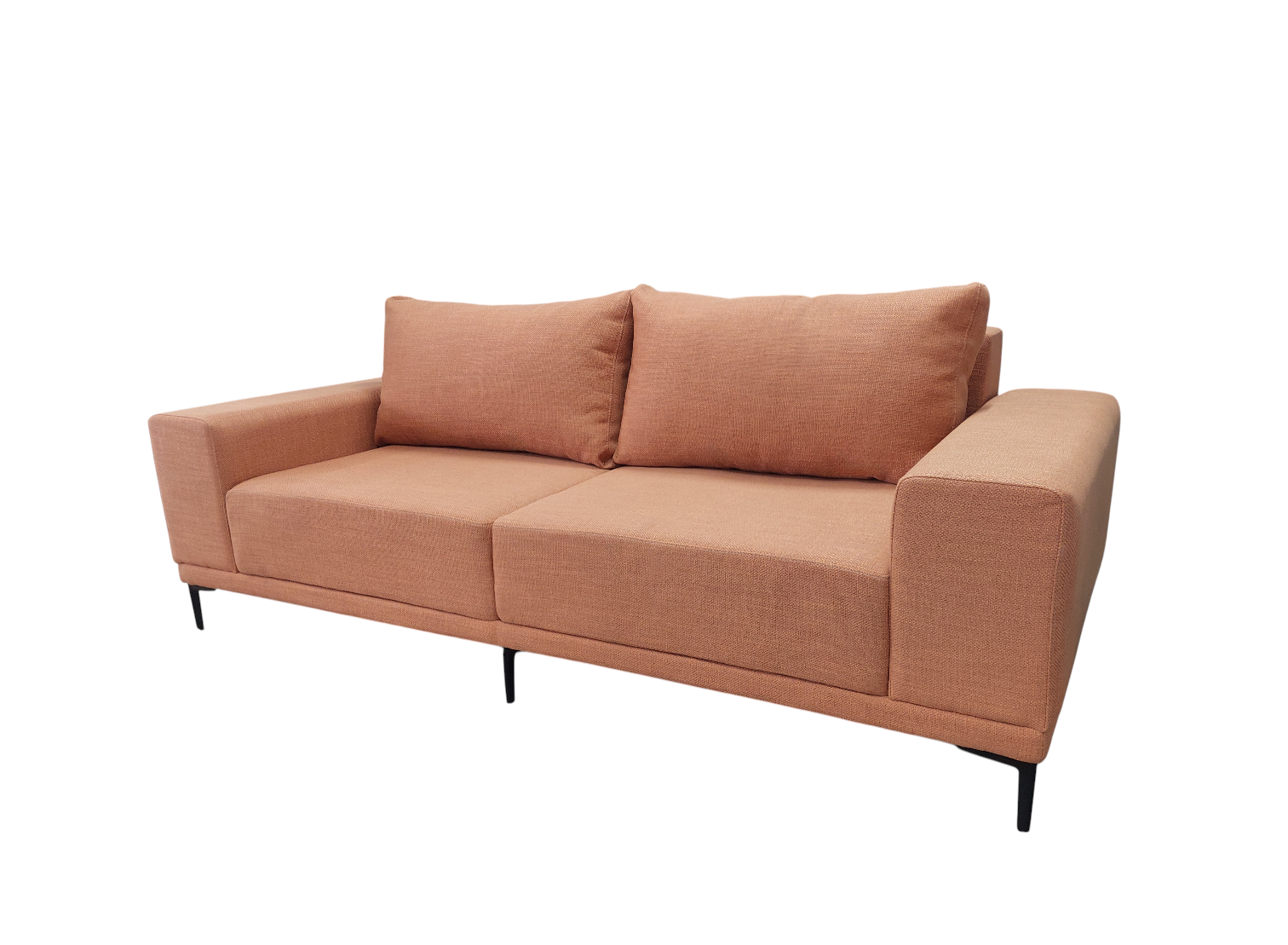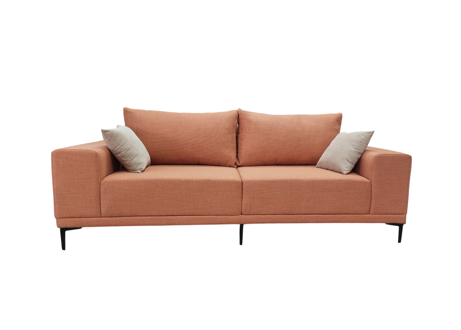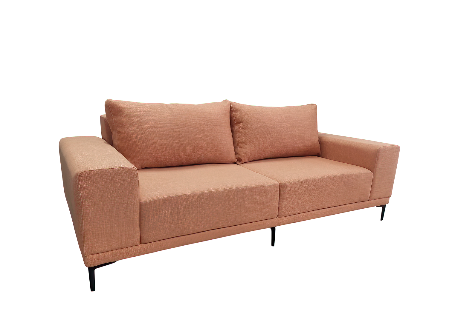 Диван оснащён широкими мягкими подлокотниками прямоугольной формы и двумя большими подушками под спину , обеспечивающими максимальное удобство при отдыхе. высокие ножки из чёрного металла добавляют модели легкости и изысканности, а также дают возможность для уборки под диваном не отодвигая его.