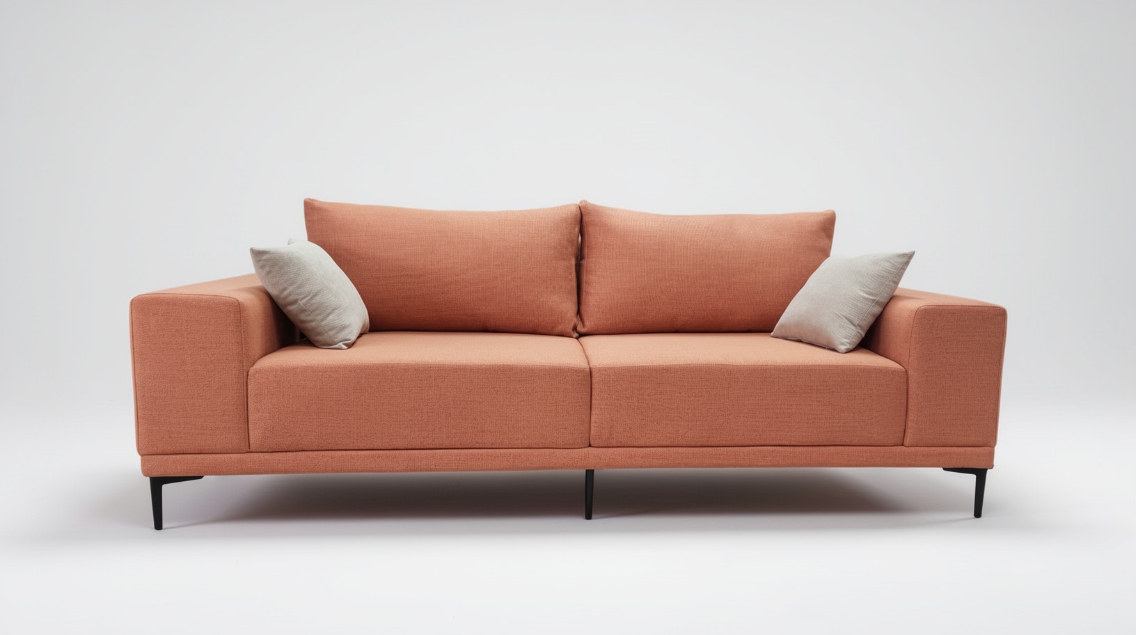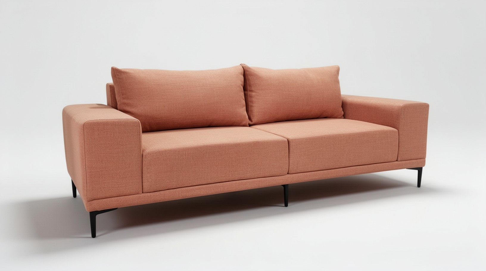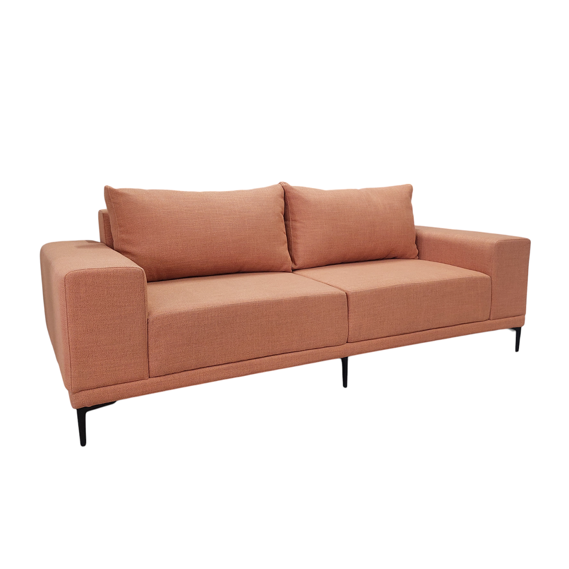 Диван оснащён широкими мягкими подлокотниками прямоугольной формы и двумя большими подушками под спину , обеспечивающими максимальное удобство при отдыхе. высокие ножки из чёрного металла добавляют модели легкости и изысканности, а также дают возможность для уборки под диваном не отодвигая его.